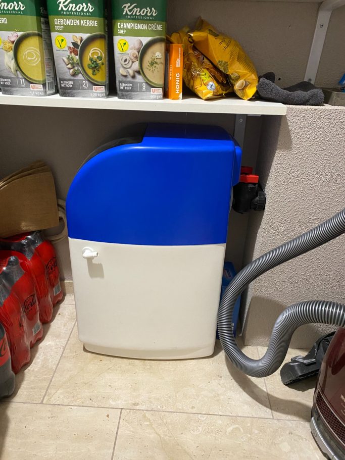 In het eerste voorbeeld is gebruik gemaakt van een waterontharder met een losse zoutbak, de waterontharder is in de meterkast geplaatst en het zout reservoir is in een kast geplaatst. Het zoutreservoir zit met een speciale slang aangesloten naar de ontharder. De slang is door de kruipruimte gelegd zodat dit netjes is weggewerkt. Voor de afvoer hebben wij op de hoofdafvoer van het huis een extra aftakking gemaakt en daar de afvoerslang van de waterontharder op aangesloten. Op deze manier is de waterontharder en de zoutbak ook met beperkte ruimte mogelijk.